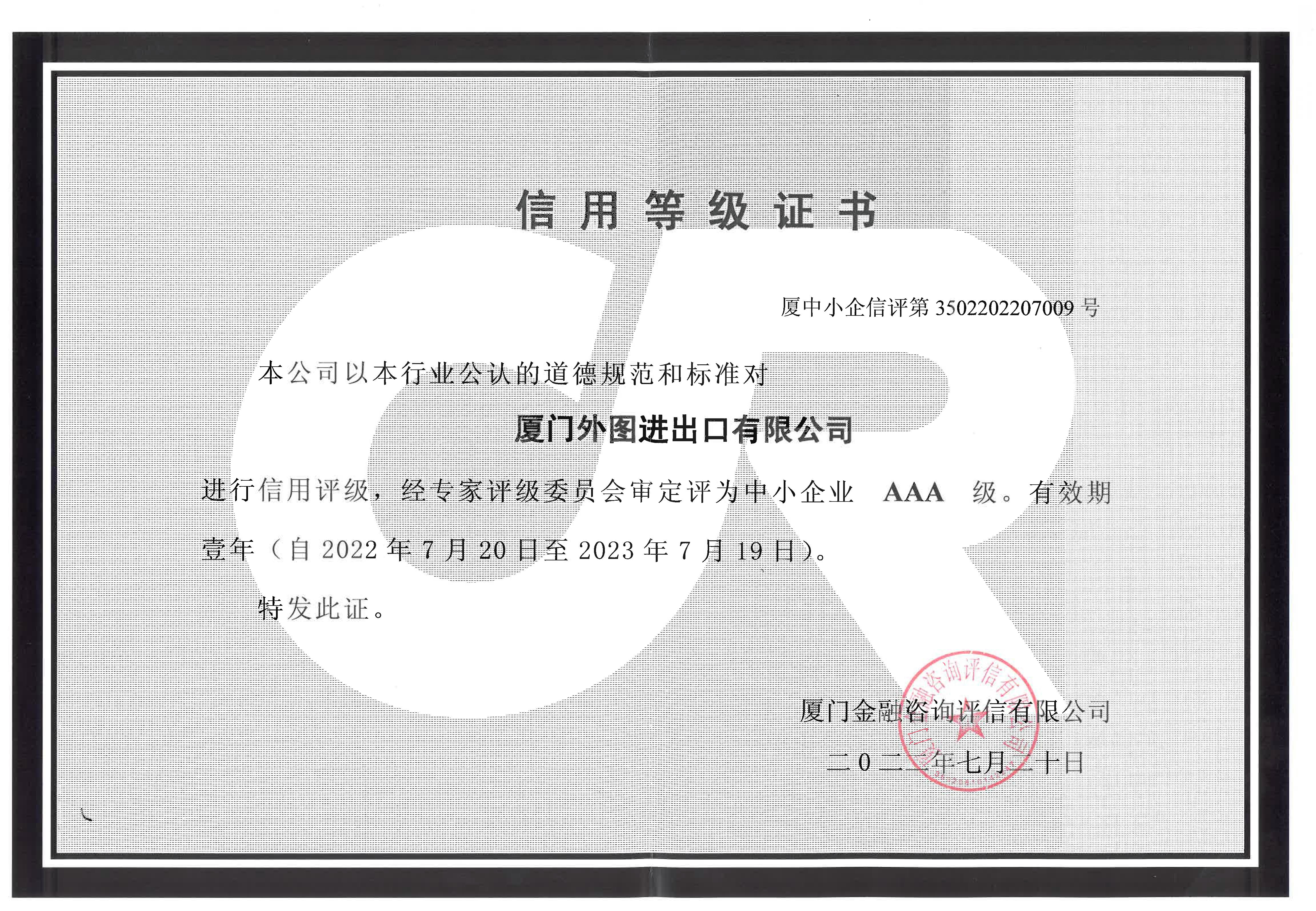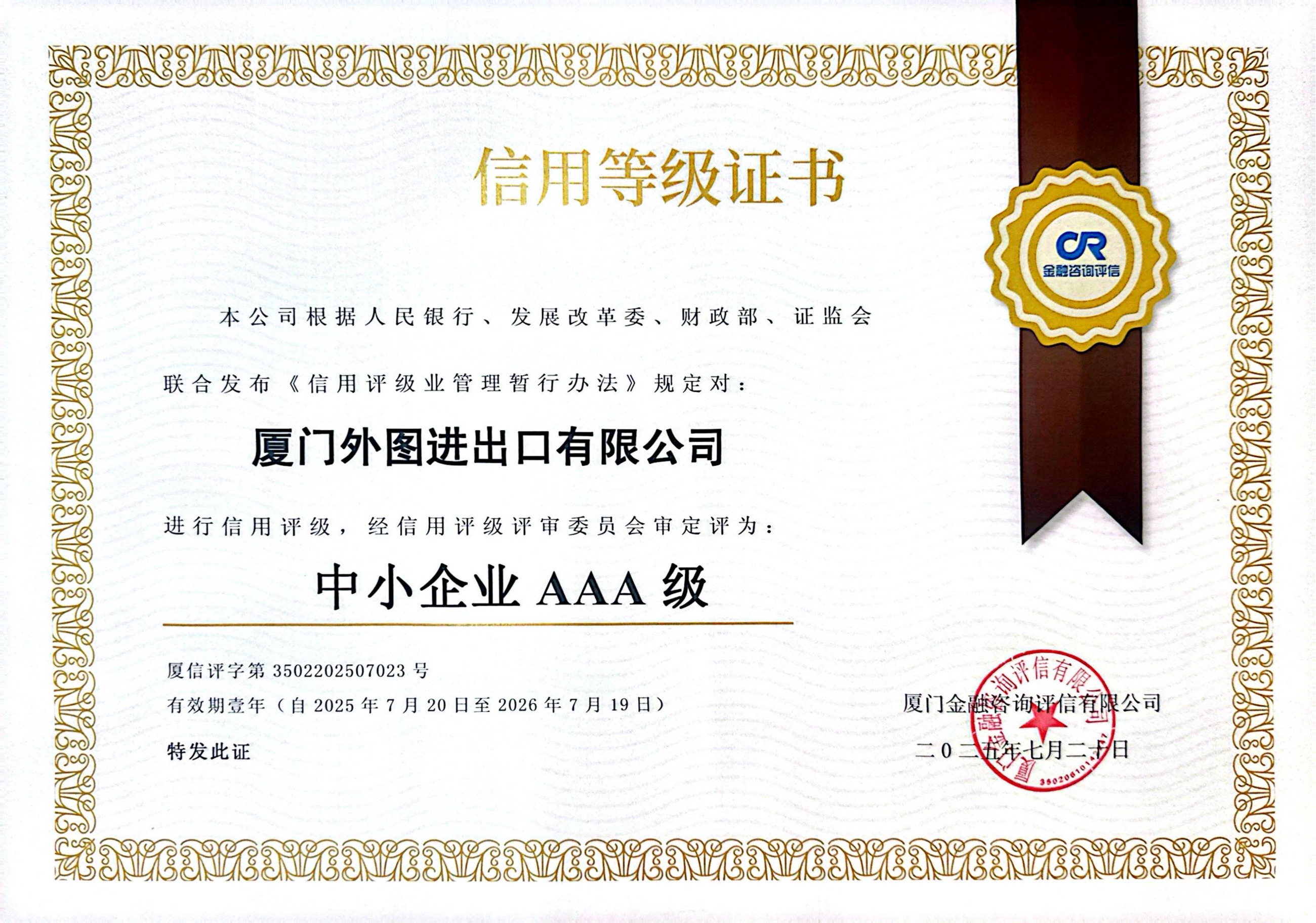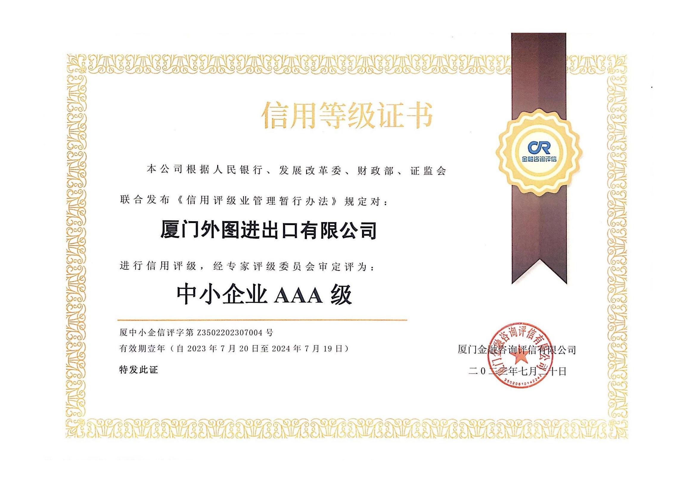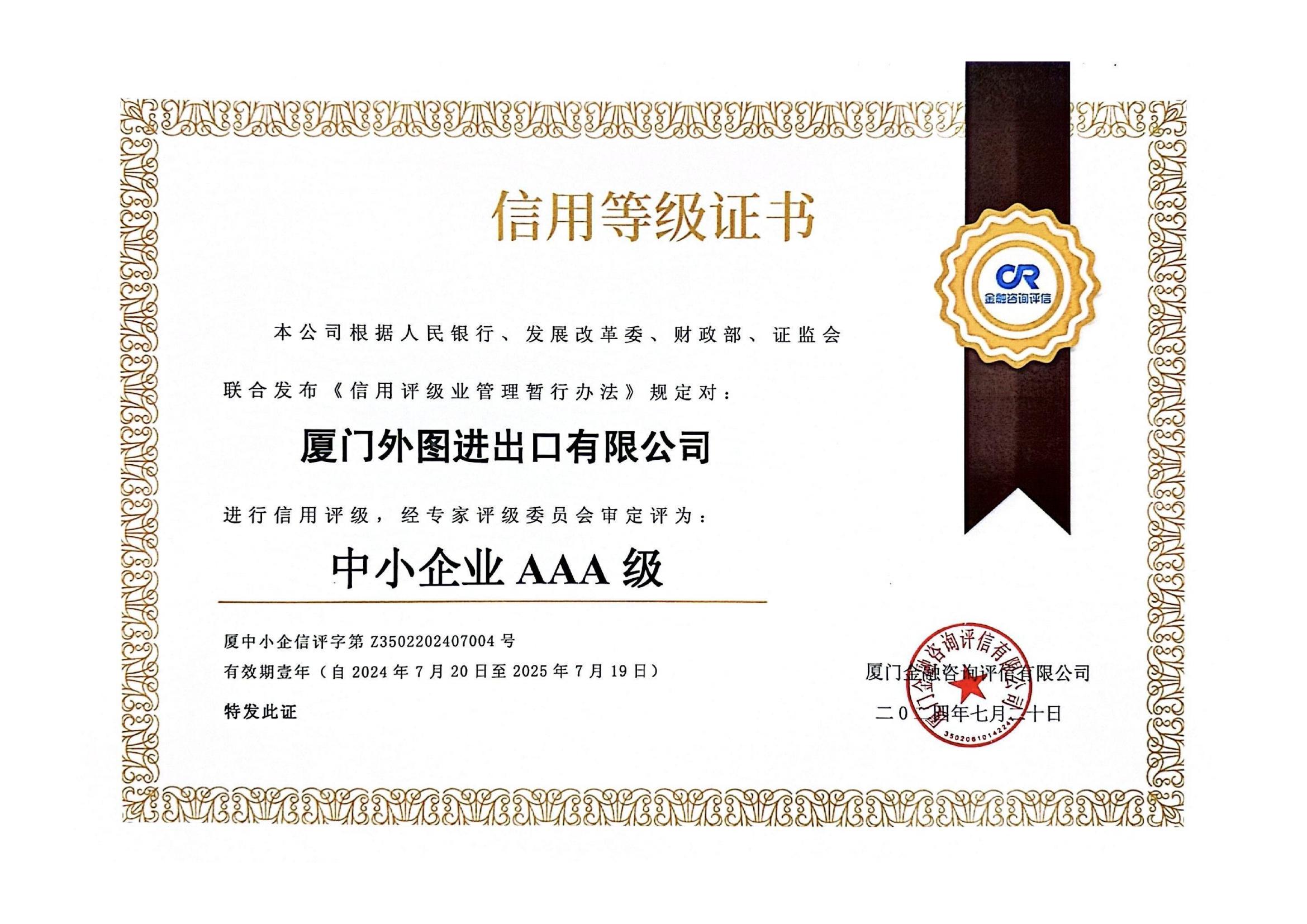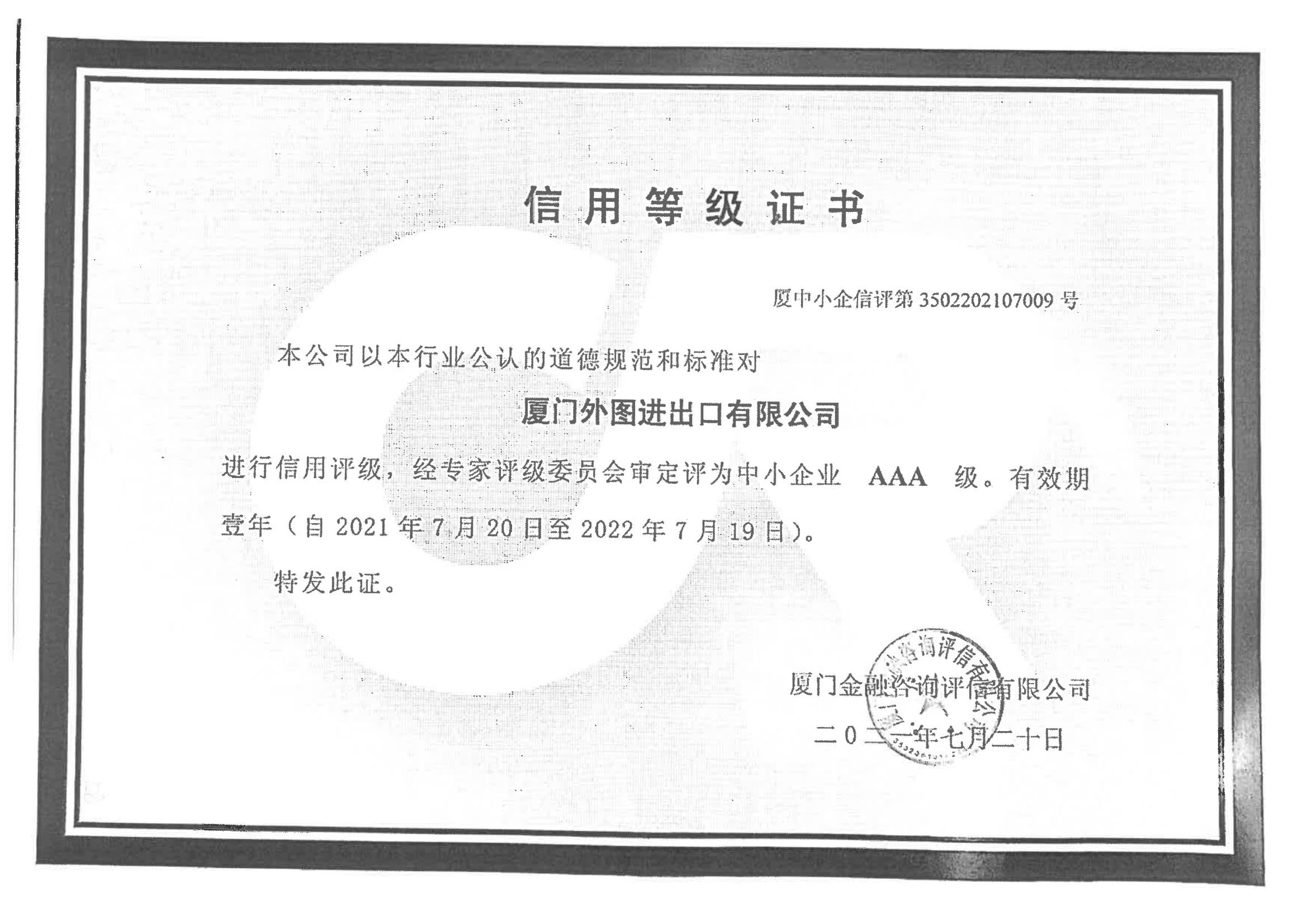 中小(xiǎo)企業(yè)信用(yòng)等級AAA級--2021-2026年(nián)度